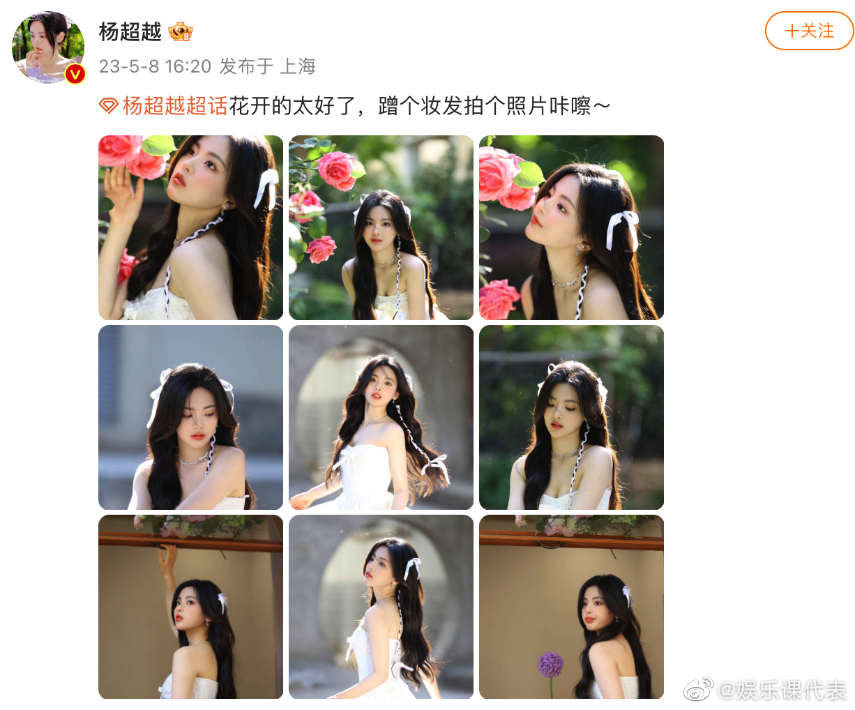 #杨超越春日鲜花大片##杨超越白裙造型# @杨超越 在微博上分享出春日鲜花大片,九宫格每一张都好漂亮!身穿白裙置身鲜花中,氛围感十足。
