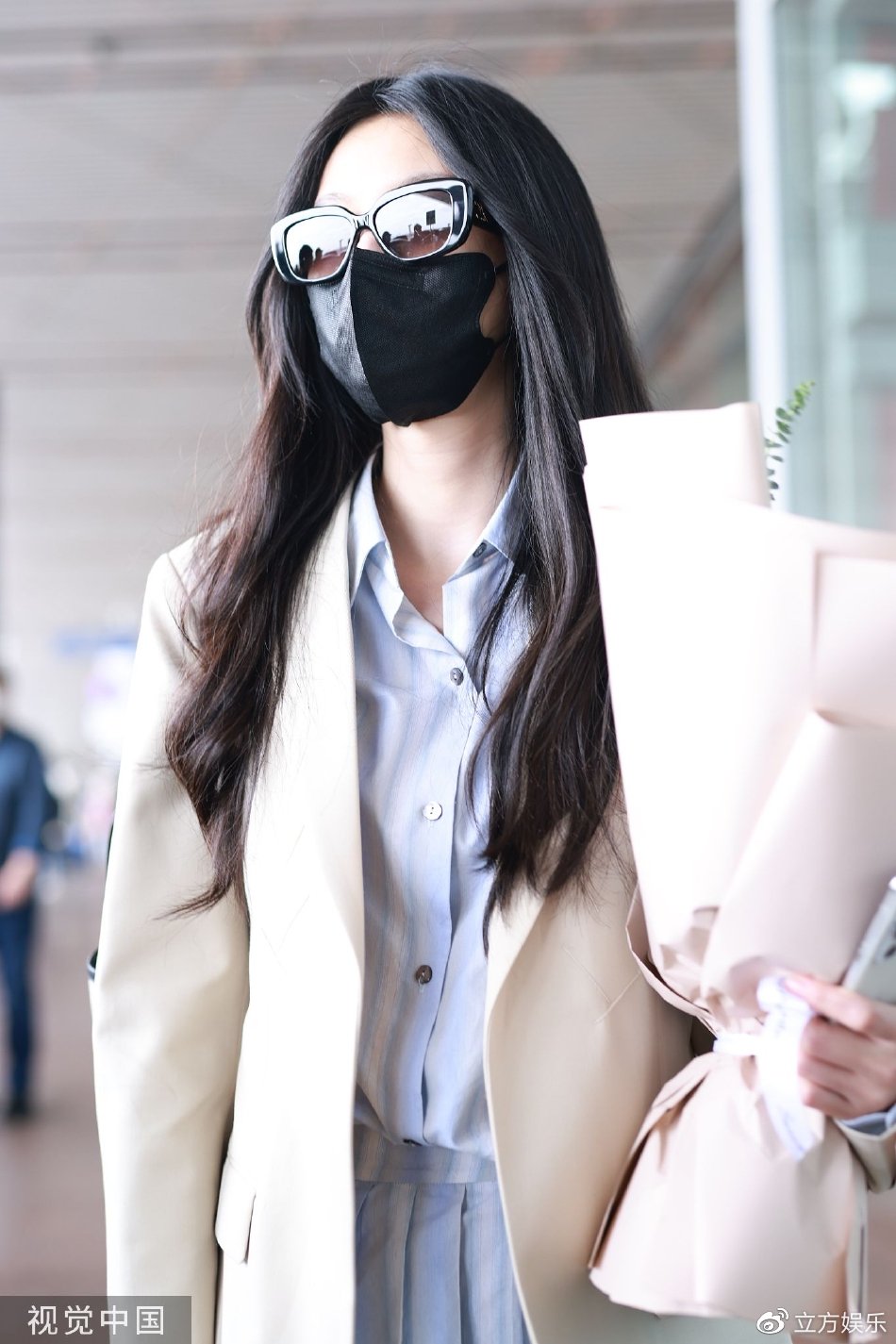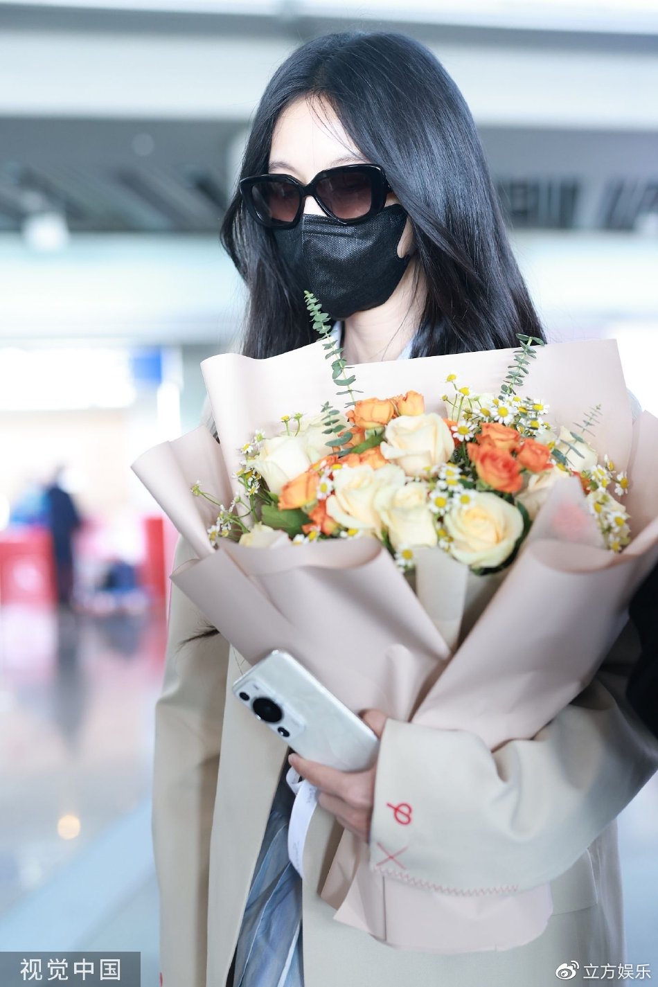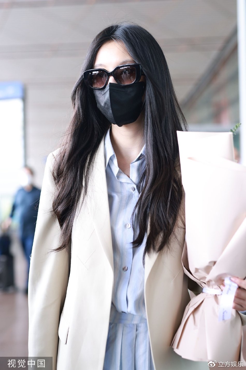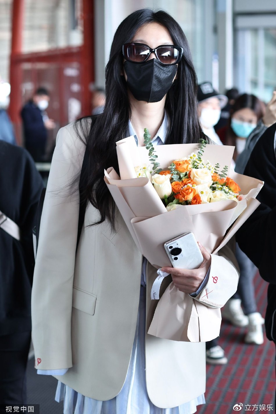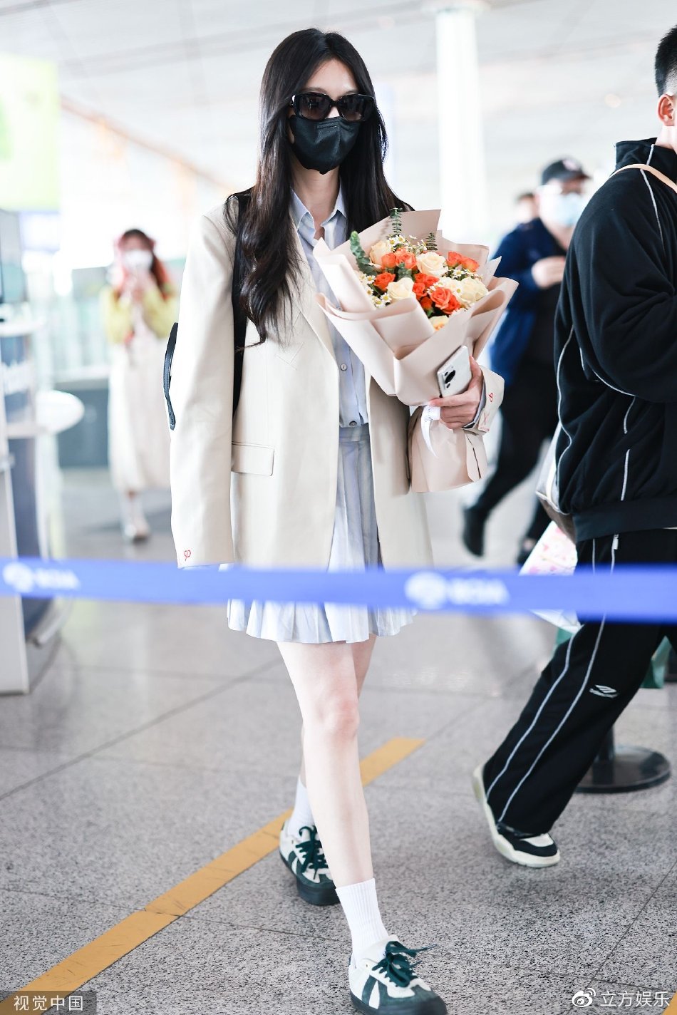 4月28日,张俪手捧鲜花现身机场,穿米白色西装搭配衬衣短裙身材有型,长发披肩戴墨镜气场全开。