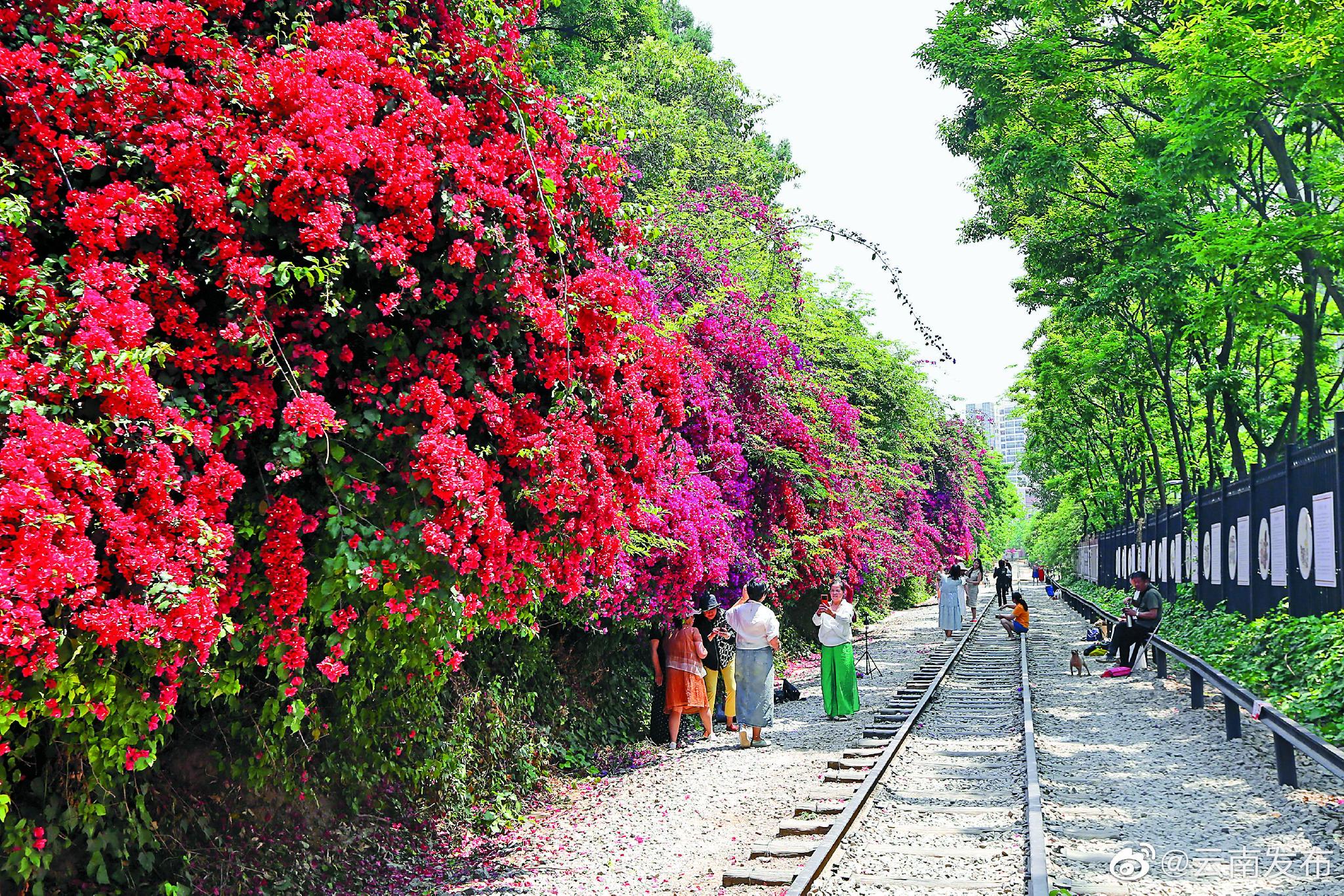 连日来,昆明地台寺附近的米轨铁路旁绵延数百米的三角梅陆续盛开,姹紫嫣红的壮观花景吸引众多市民游客前来拍照打卡。该段铁路是有着百年历史的滇越米轨铁路,目前已经停止使用。近年来,五华区莲华街道在铁路沿线两侧栽种三角梅300余株,让百年米轨变身新晋“网红”,传承了文化,汇聚了人气。(云南日报 谢蕊灿 摄)