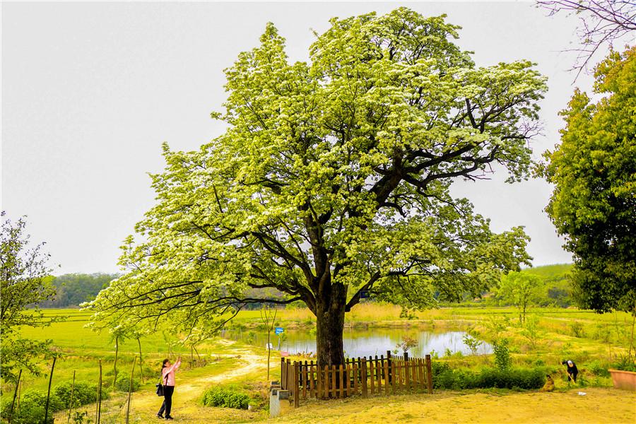 2023年4月15日,安徽省合肥市庐江县冶山镇田埠村毕家庄有一棵500余岁的流苏古树进入盛花期,满树的花朵远看似村前一朵祥云,近看如一片皑皑白雪,蔚为壮观。 这棵植于明代的流苏树已生长500余年,至今仍根深叶茂,树高10余米,胸围近3.5米,树冠数十平方米。每年4月中旬,细长的花瓣挤满枝头,花满树冠,吸引了周边游客前往观看。 据村民介绍,流苏树每年的4月10日前后开放,花期持续10天左右。今年由于天气等原因,花朵茂密,花期最长。多年来,村民对古树倍加珍爱,自发进行护树爱树。2014年,安徽省政府将其列为国家一级古树进行保护。(李红兵)