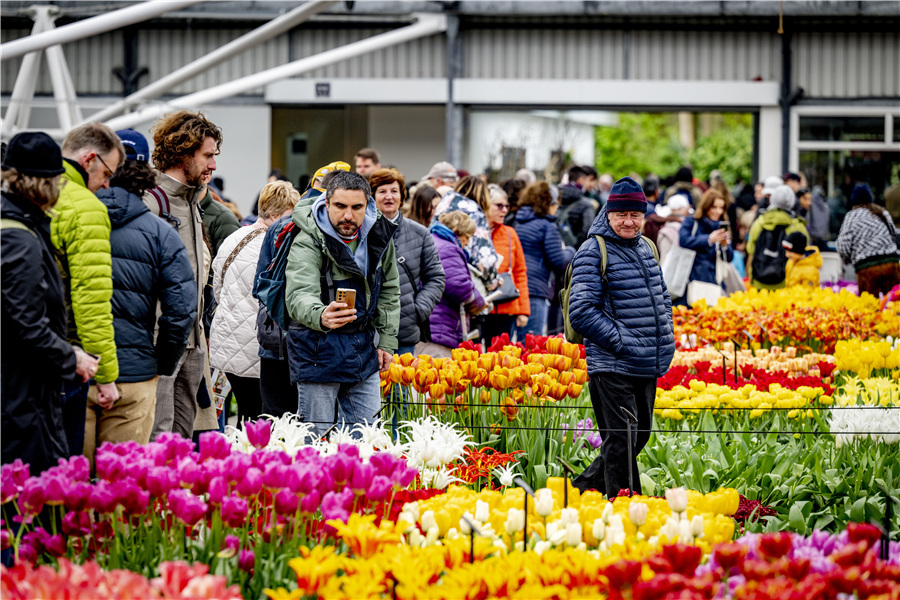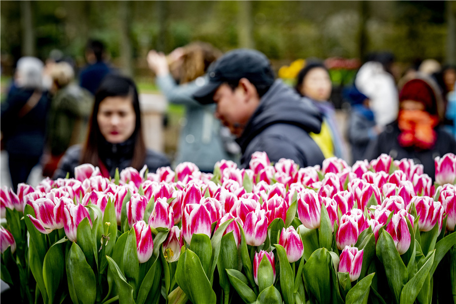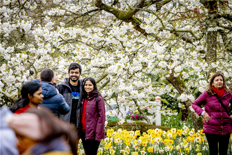 当地时间4月10日,荷兰利瑟,库肯霍夫公园内的人群欣赏鲜花。