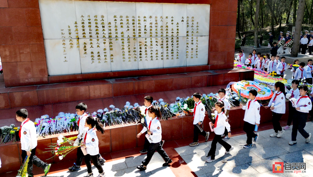 学生们佩戴鲜艳的红领巾,在革命烈士纪念碑前重温少先队入队誓词,“准备着:为共产主义事业贡献力量”的宣誓在烈士陵园上空久久回响。宣誓完毕后,师生们迈着庄严的步伐敬献鲜花,并在纪革命烈士念碑前鞠躬致敬。