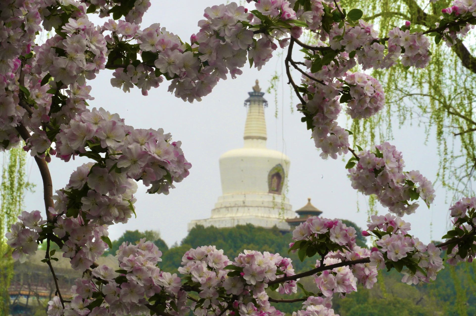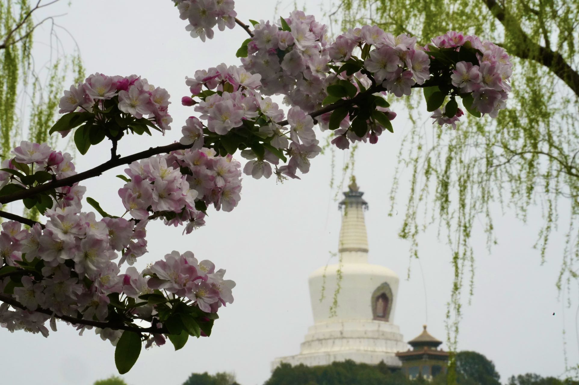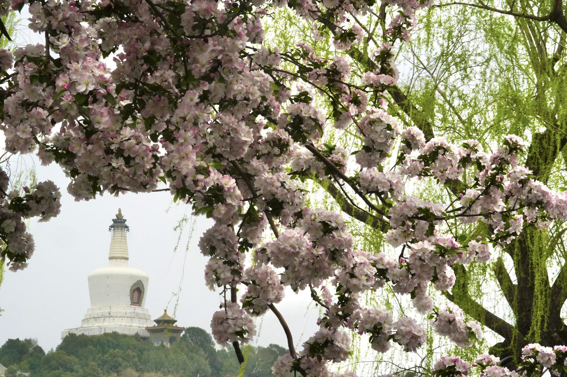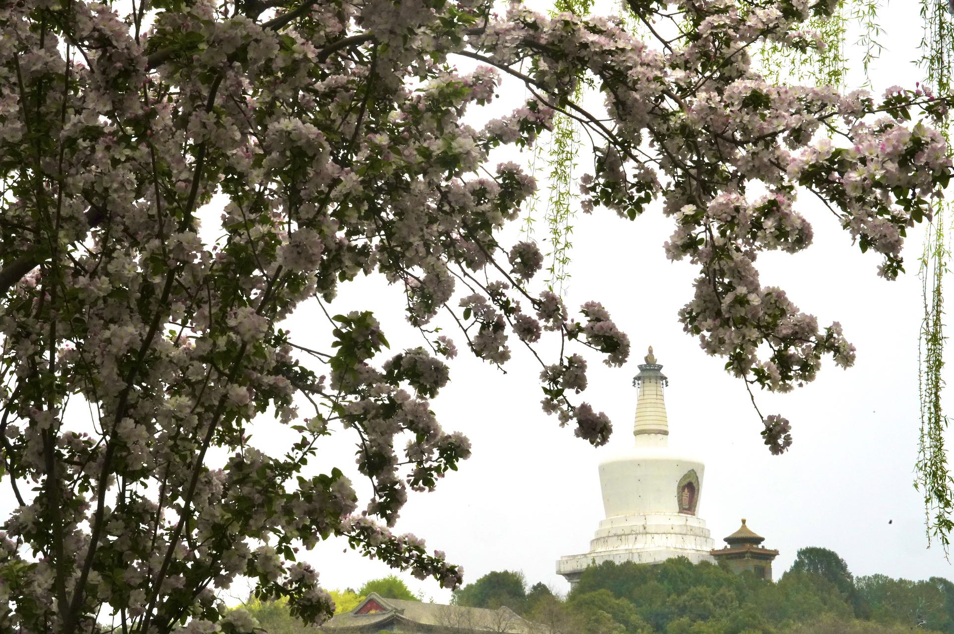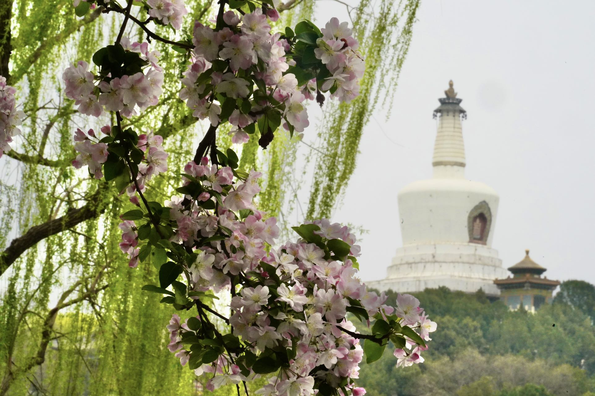 双红榭广场,永安寺普安殿院内的西府海棠也是别有情趣,一枝枝一串串的花粉色与白塔、雕梁画栋的建筑交相辉映,融为一体。