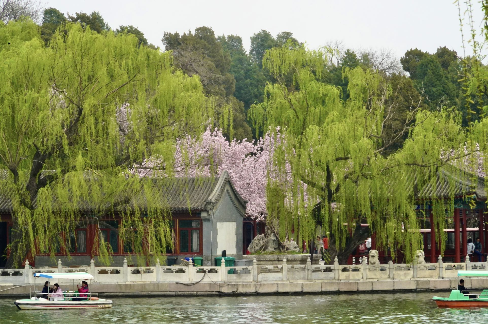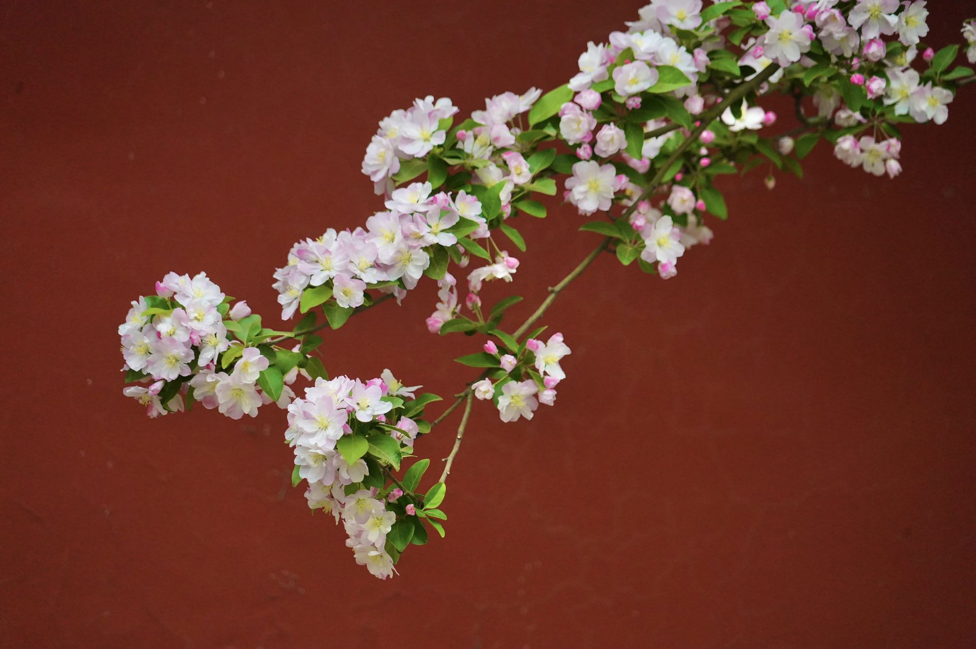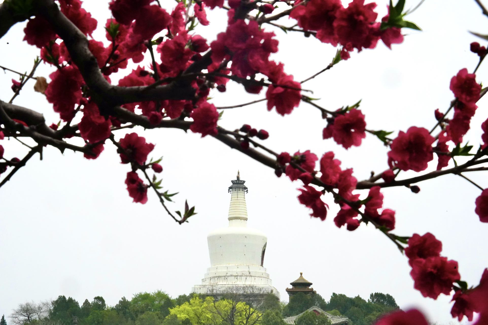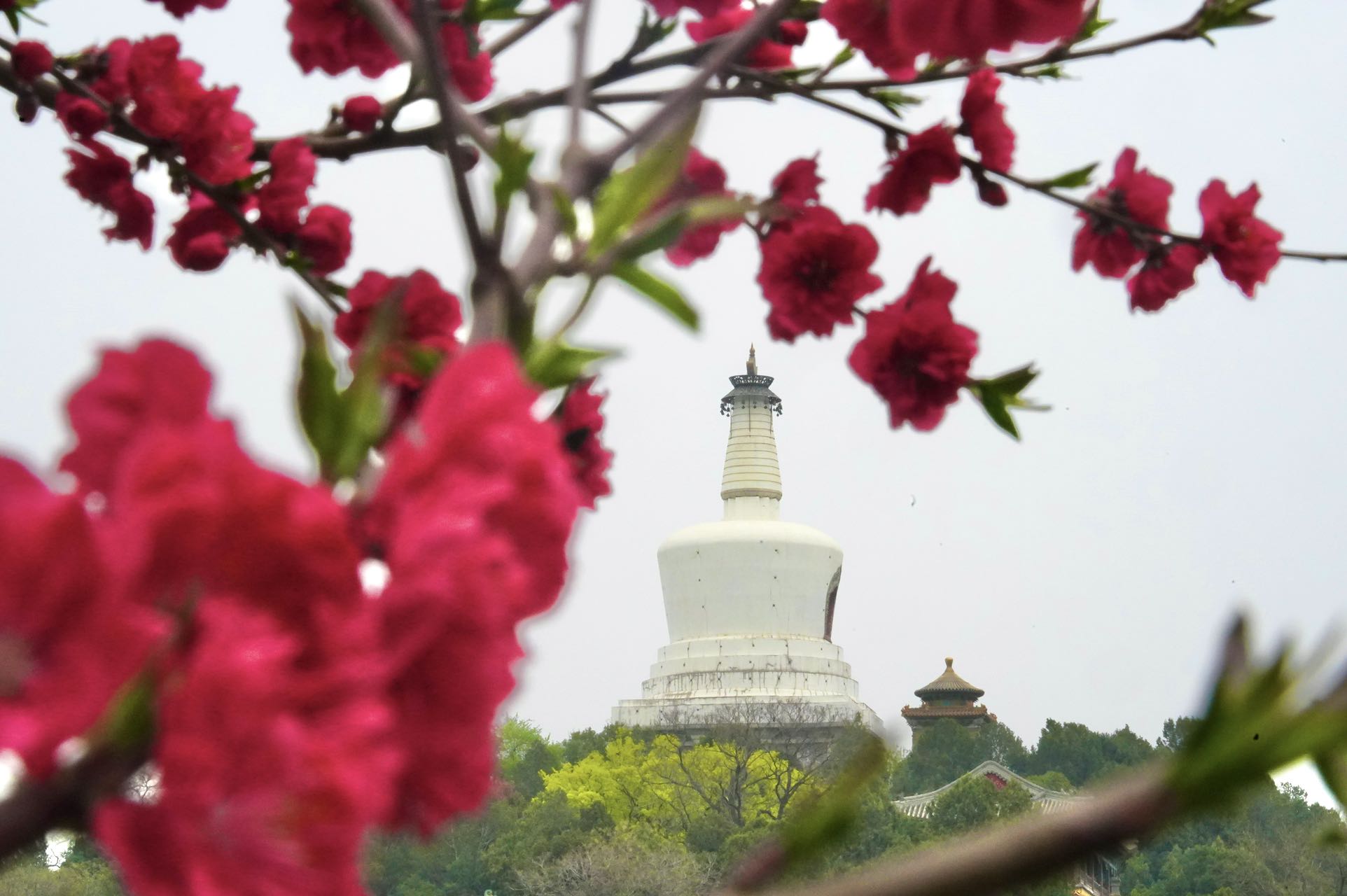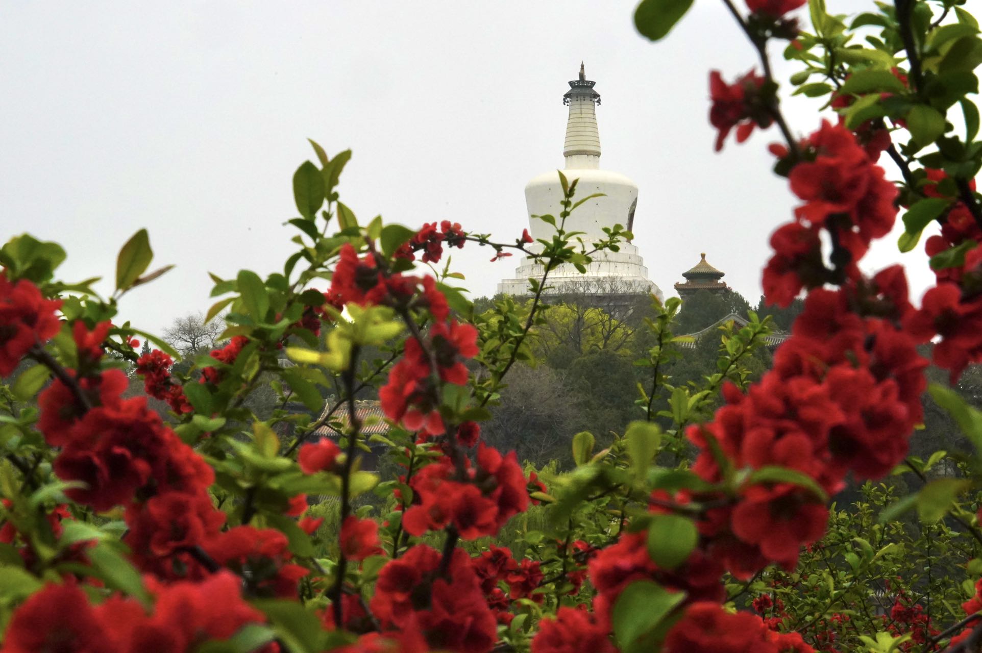 双红榭广场,永安寺普安殿院内的西府海棠也是别有情趣,一枝枝一串串的花粉色与白塔、雕梁画栋的建筑交相辉映,融为一体。
