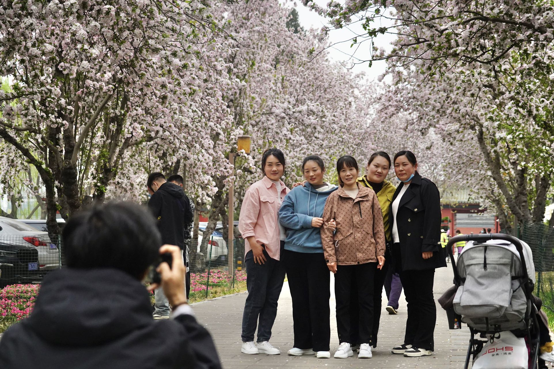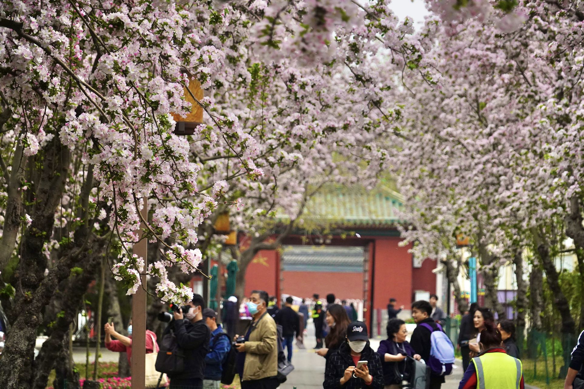 4月3日,北海公园西门内30多颗西府海棠盛开,形成一道粉嫩的花拱门。