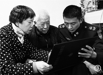 图③:杨杰(右一)和王伟父母翻看王伟烈士生前相册。马文卿摄