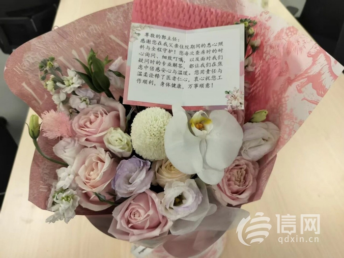 患者送来的鲜花。(来源:青岛市公共卫生临床中心)在青岛市公共卫生临床中心肿瘤内科的病房里,一束盛开的鲜花散发着馥郁的芬芳。送花的年轻女孩刚刚结束一场人生重要面试。她紧紧握着医护人员的手,说:“谢谢你们,是你们守护了我爸爸,也守护了我的未来。”