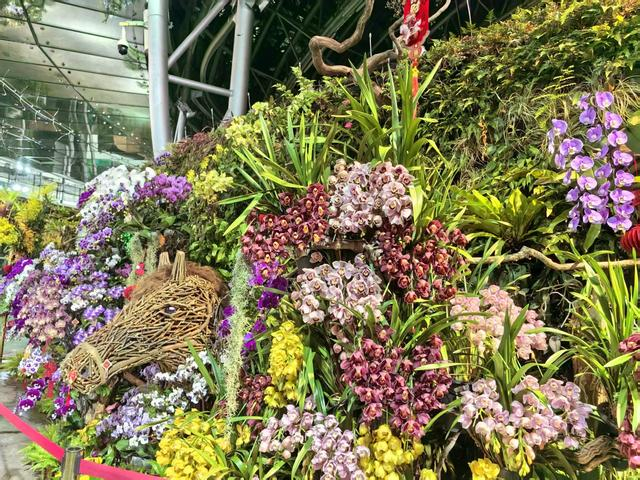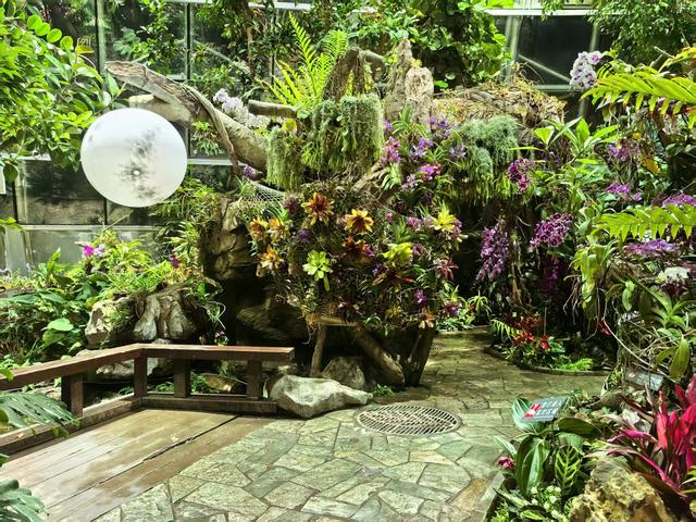 门区用大量鲜花营造出花墙、花山、花树等景观,让人赏心悦目。幽谷兰境以原生境的形式,集中展示了苦苣苔科、秋海棠科、兰科、蕨类植物、萝藦科、苔藓等植物,展现了兰花的原生境,景区内的月亮、蝴蝶、瓢虫等各色彩灯不时闪亮,更增添了迷幻的色彩。