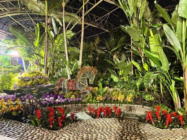 作为2026新春奇妙夜的核心展区,国家植物园(北园)热带展览温室内以兰花为主的近千个品种的万余株花卉,将这里装扮成了花的海洋。四季花园展区内,镂空的骏马在五彩斑斓的灯光下奔驰在花海之中,腾起的阵阵水雾,营造出一种梦幻般的氛围。